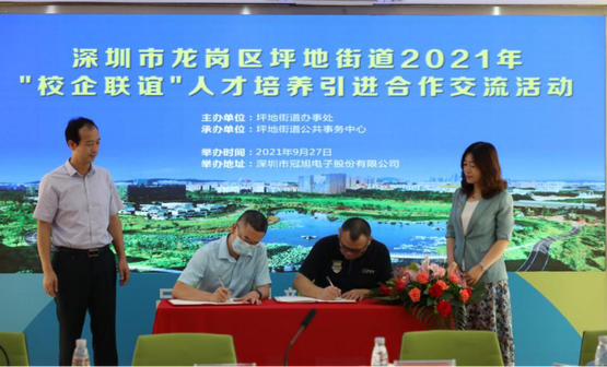 交流会上,我校作为参会高校代表进行发言,感谢主办方搭建的校企对接交流平台,并简单介绍了我校基本情况和毕业生生源信息。随后,在龙岗区人社局和坪地街道办领导的见证下,我校与深圳市冠旭电子股份有限公司签订了合作意向书。