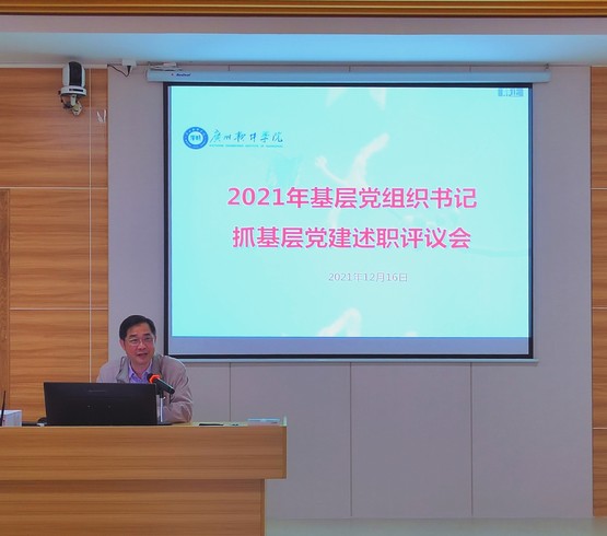 党委书记刘友坤在总结点评时指出,根据广东省委教育工委的要求,学校党委在每年年底举行基层党组织书记述职评议会,通过述职评议会更进一步统一思想、坚定信念、凝聚力量,并在梳理年度工作取得的成效和存在的不足中总结经验,服务学校今后的发展稳定大局。今年,各党总支、直属党支部书记能按照学校党委的要求,立足本职,结合系部的职能开展工作,特点特色更突出,工作经验更成熟,业务水平也有了明显的提升。在新的一年,希望各基层党组织制定好工作计划,加强理论学习,逐步解决当前工作中存在的不足。要在做好创新工作形式、工作方法上下功夫,以打造样板支部为抓手,结合为师生办实事等活动,做好品牌建设,特别是在党建+教育教学、党建+创新就业、党建+素质文化教育等“党建+”方面,需要常抓不懈,取得成效。随后,在做好意识形态工作、规范基层党组织活动开展和经费使用、新形势下校园疫情防控等方面提了工作要求。