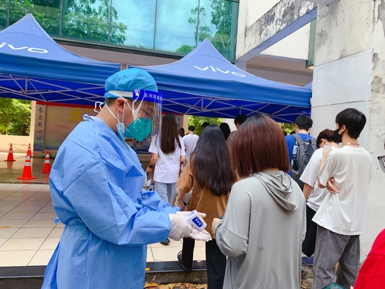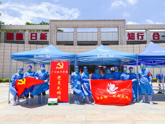 本网讯 根据从化区疫情防控工作统一安排,2022年6月27日,学校进行新一轮全员核酸检测。为保障全校师生有序进行核酸检测,学校“丝木棉”党员先锋队约70名教职工党员主动报名走上志愿服务岗位,化身“小蓝”,投入到核酸检测保障工作中。